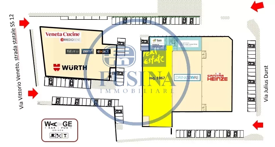 Der Gebäudekomplex erstreckt sich von der Vittorio Veneto Str. (Brenner Staatsstraße - SS12) bis zur Julius Durst Str.und verfügt über vier unabhängige Eingänge, die ein Höchstmaß an Funktionalität und Flexibilität in der Nutzung garantieren. Die Lage ist strategisch sehr günstig: Die Immobilie ist von den Hauptverkehrsstraßen, mit 11 800 Fahrzeugen pro Tag, der Autobahn und der Bahnlinie aus gut sichtbar, was eine hohe Sichtbarkeit und Erkennbarkeit gewährleistet.