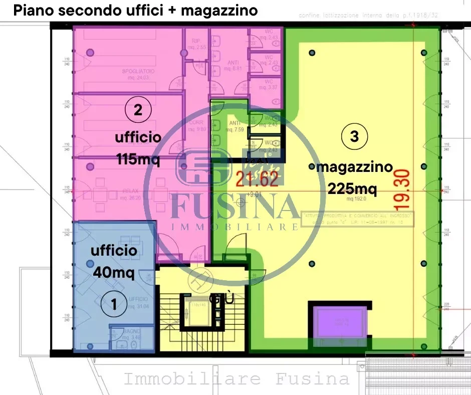 Im zweiten Stockwerk mit einer Fläche von 365 m² befinden sich zwei Büros, eines mit 115 m² (offene Fläche) und eines (derzeit an eine Tanzschule vermietet) mit 250 m²
