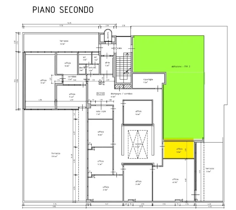 Al piano secondo, con 365 m² di superficie, abbiamo due uffici uno di 115m² (open space) e uno (attualmente locato a scuola di ballo) da 250m²